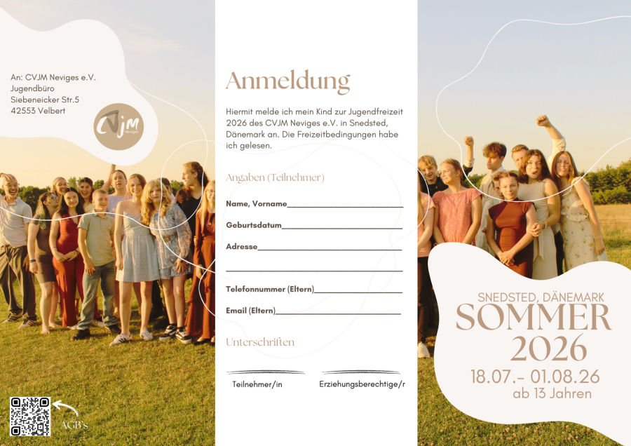 Der CVJM-Express bringt Dich 2026 nach Dänemark, wo Du mit rund 40 Leuten in deinem Alter zwei Wochen in einem tollen Haus erleben wirst. Ob Spannung bei den Abendshows, jede Menge Spaß bei Actiongames oder chillige Nachmittage am nur 10 Minuten entfernten Meer - Du wirst definitiv die Gelegenheit haben, mit coolen Leuten eine richtig gute Zeit zu verleben.